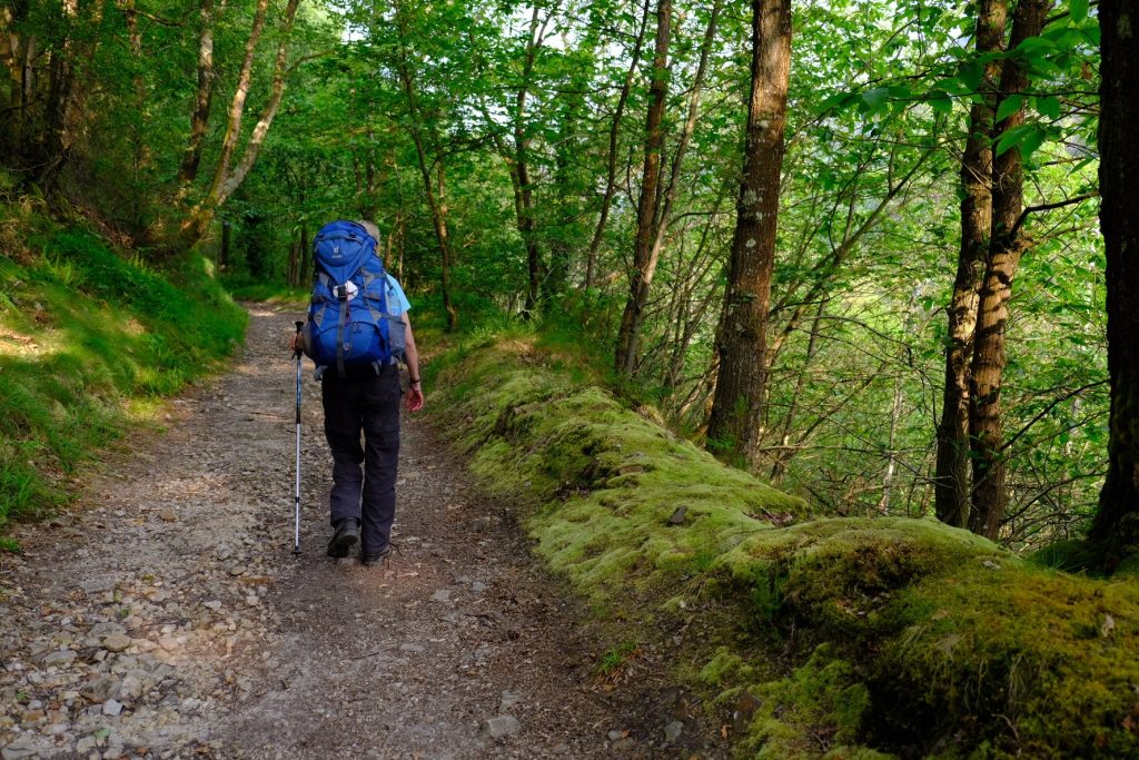 Dann führt der Jakobsweg meist über Wege, die auf halber Höhe parallel zum Hang verlaufen. Besonders im ersten Teil der Strecke ist nach links der Blick auf ein fantastisches Bergpanorama frei. Im zweiten Teil wandern wir dann meist auf Wegen, die, Waldwegen täuschend ähnlich, dicht von Baum- und Strauchreihen umwachsen sind.