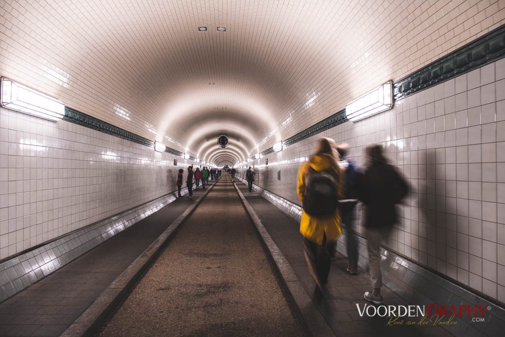 Ines hat die tolle Idee, dass wir zum Alten Elbtunnel (Baujahr 1911) gehen und wir uns darin entgegenlaufen. Der Alte Elbtunnel ist absolut sehenswert. Früher wurden dort die Fahrzeuge und Fuhrwerke mittels Aufzüge 24 Meter hinauf- und hinunter gelassen. Heute dürfen nur noch Fußgänger und Radfahrer durch den 426,5 Meter langen Tunnel hindurch.