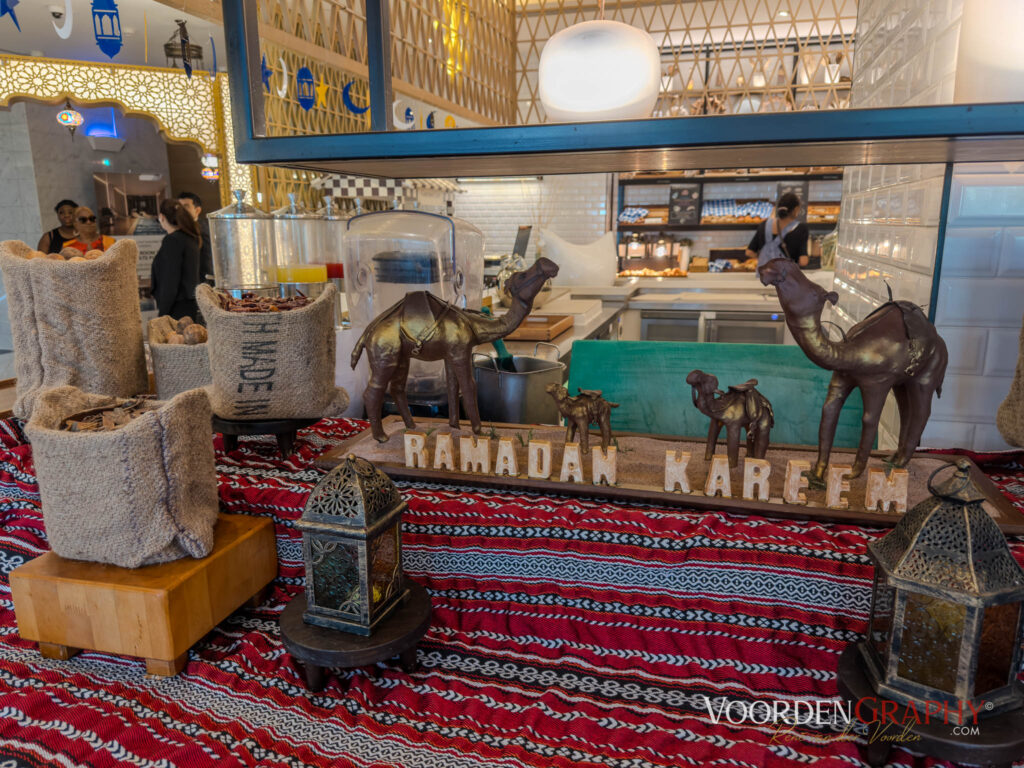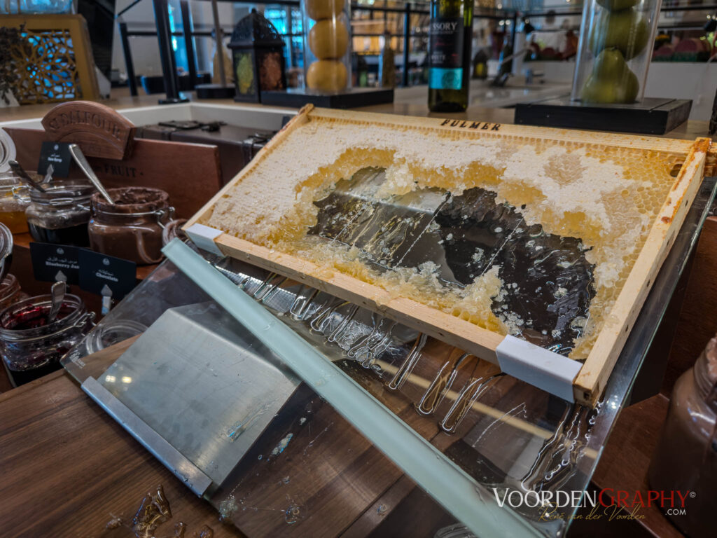 Freitag 20. Februar 2026: es ist sonnig mit 30 °C. Die restlichen Grippe-Symptome werden bei dieser Temperatur hoffentlich schwinden. Ein fürstliches Frühstück erwartet uns im ersten OG. Der Honig wird sogar in der Honigwaffel serviert. Der Bedienstetenschwarm lässt keinerlei Wünsche offen. Nach dem Frühstück laufen wir über eine Brücke am Hotel am Fluss entlang bis zur Boot Haltestelle, die die Passagiere zur anderen Seite des Ufers und hinüber zur Downtown fährt. Weiter laufen wir zur U-Bahn-Station, wo wir unsere Tickets für die U-Bahn kaufen. Auf dem Rückweg kommen wir an einer Moschee vorbei, sehr viele Gläubige breiten ihren mitgebrachten Teppich aus und beten der Stimme aus dem Minaret. Normalerweise buchen wir ja immer nichts und machen alles auf eigene Faust. Da wir etwas Grippe mit in den Urlaub gebracht haben, ist uns das aber zu anstrengend und haben kurzerhand beim netten Reiseleiter ein paar Turi-Ausflüge gebucht. In der Hoffnung, dass wir danach wieder fit sind. Am Abend fahren wir mit dem Lift auf den 18. Stock hinauf und genießen den grandiosen Ausblick auf dieser außergewöhnliche Stadt mit der tollen Skyline und bleiben dort, bis es dunkel wird und genießen den Abend und Sonnenuntergang bei grandiosem Essen auf dem Rooftop des Hotels.