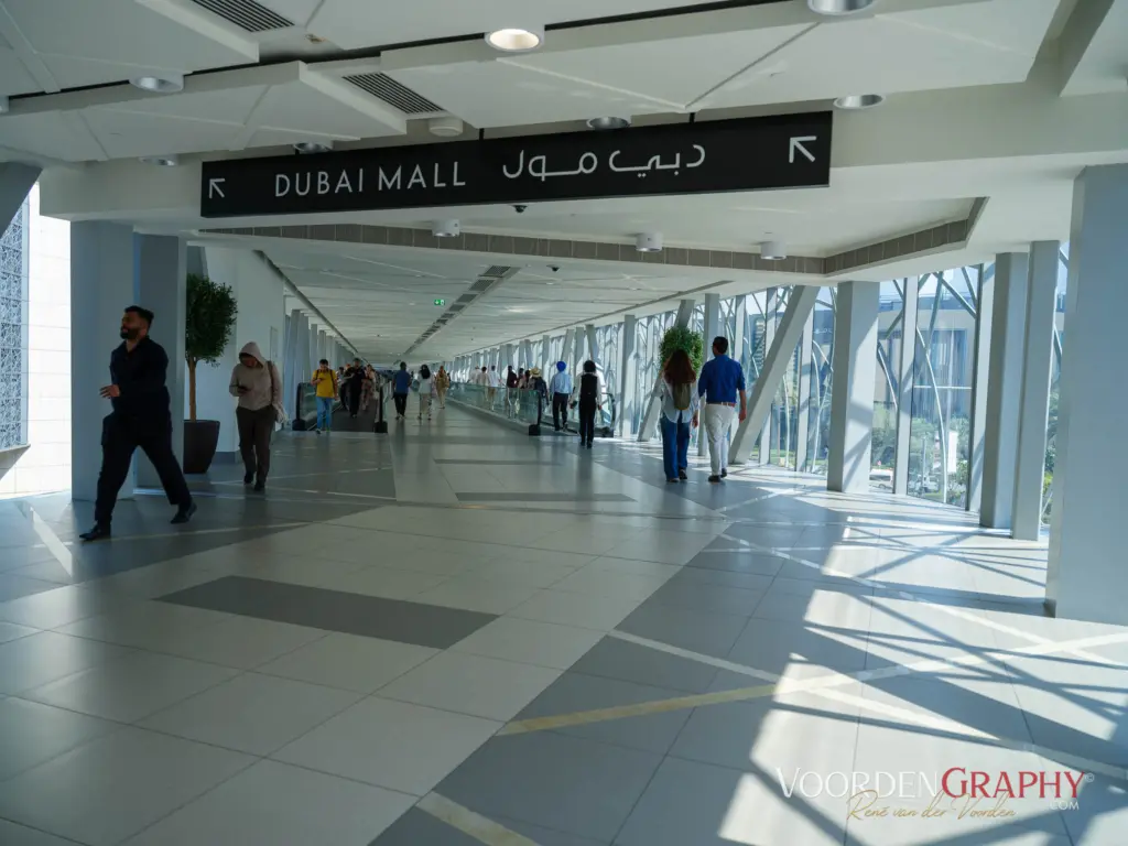 Gegen Mittag zieht es uns dann doch hinaus. Also schnüren wir die Schuhe und marschieren etwa 20 Minuten zur nächsten Metrostation. Bereits dort merkt man: Hier denkt man groß. Ein riesiger, ellenlanger, komplett klimatisierter Zubringer führt direkt zur Dubai Mall – inklusive Laufbändern. Und zwar nicht nur ein paar Meter, sondern gefühlt eine kleine Expedition. Ganze 15 Minuten stehen wir entspannt auf dem Band, während wir uns wie VIPs durch eine futuristische Röhre chauffieren lassen. Laufen ohne zu laufen – effizienter geht es kaum.