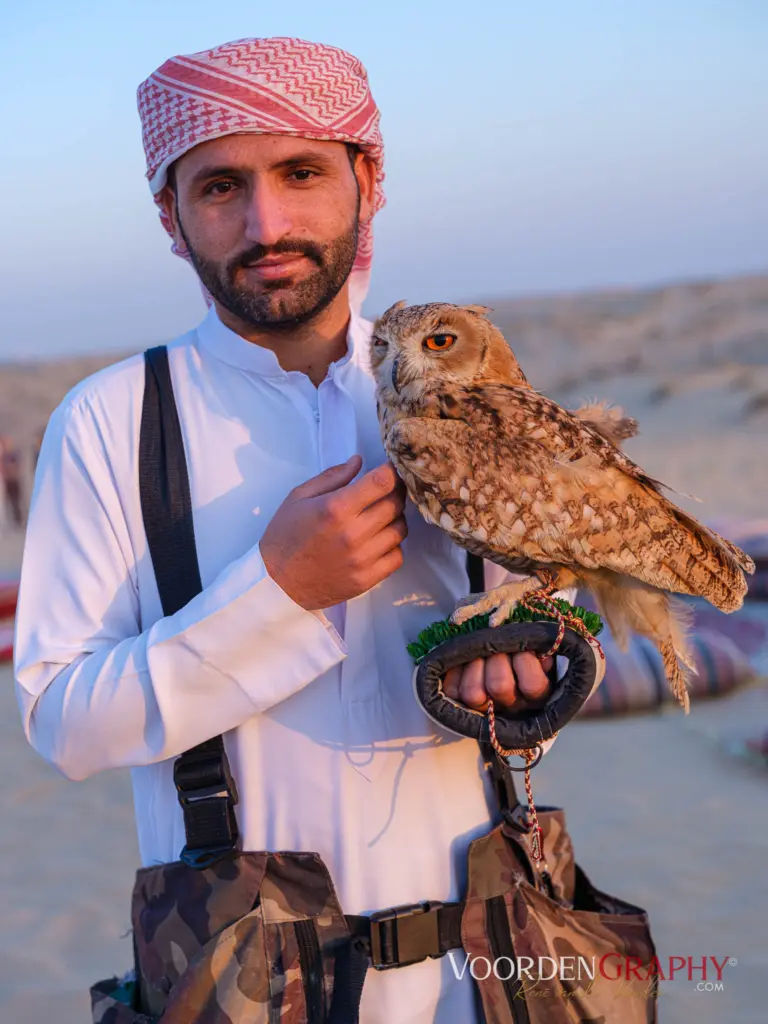 Anschließend erwarteten uns Tee, Kaffee, Datteln und eine Art Muffin zur Stärkung auf gemütlichen Bänken. Außerdem durfte ein Erinnerungsfoto mit einem Falken nicht fehlen. Bevor jedoch die Show begann, erklärte der Falkner anschaulich, wie die Tiere fliegen, jagen und für die Menschen eingesetzt wurden. Faszinierend – und gleichzeitig ein kleiner Reality-Check, wer hier eigentlich der Chef in der Luft ist.