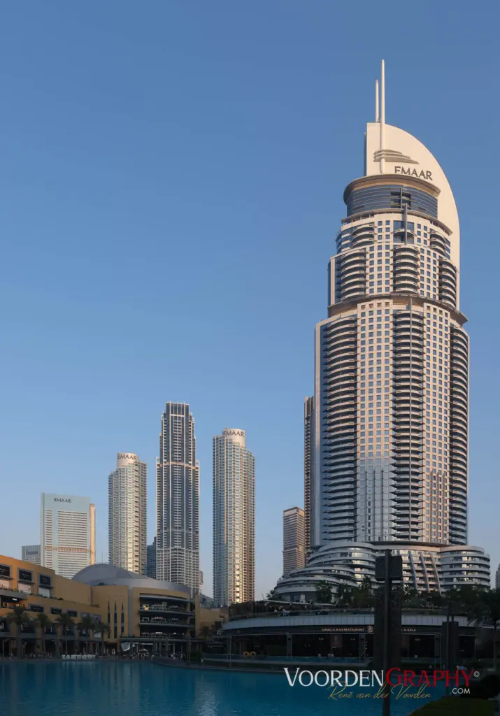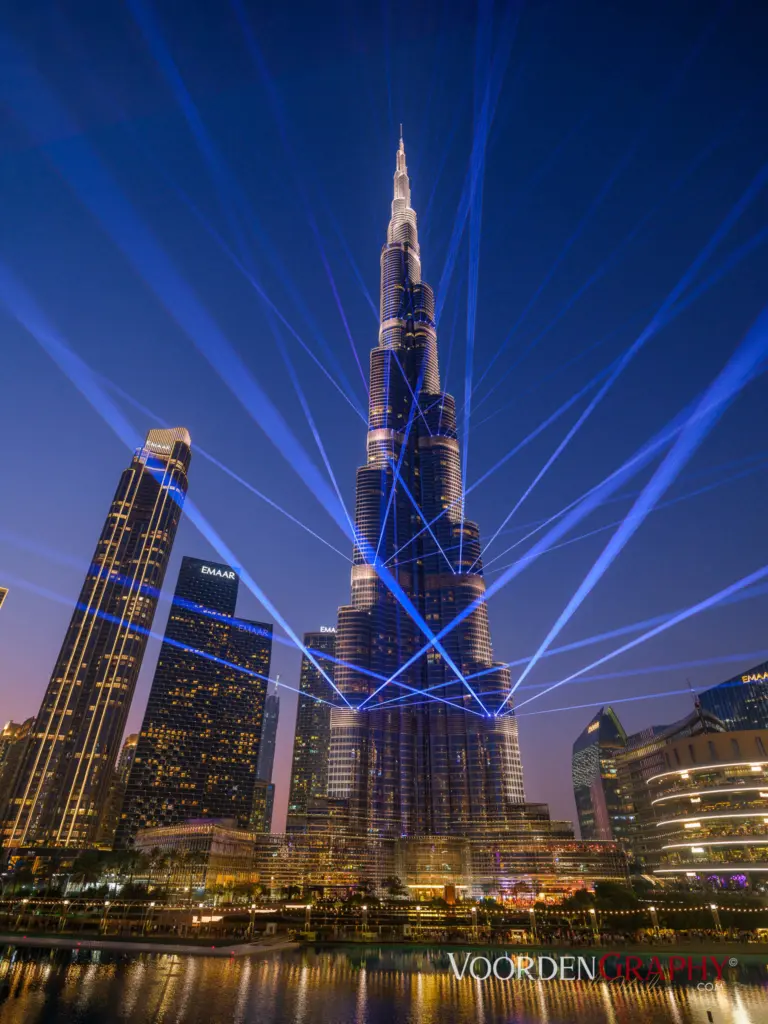 Vor uns liegt die berühmte Dubai Fountain im Burj Lake – direkt zwischen Burj Khalifa und Mall. Sie gilt als eines der größten choreografierten Wasserspiele der Welt. Und wenn die Musik einsetzt, weiß man sofort warum.