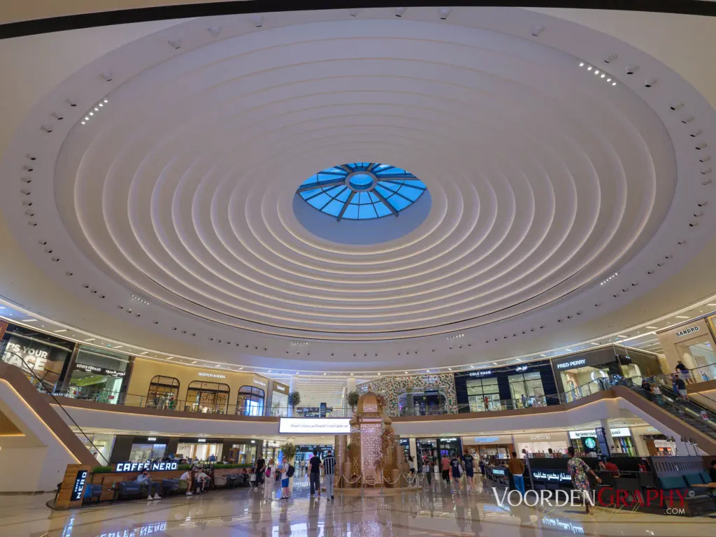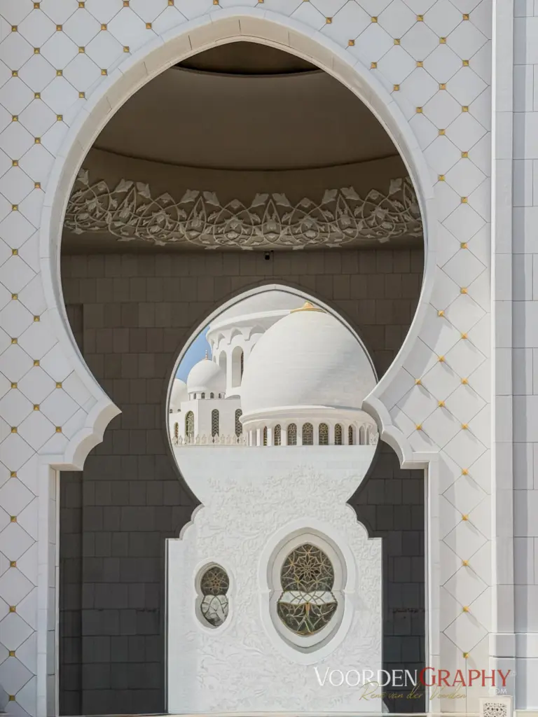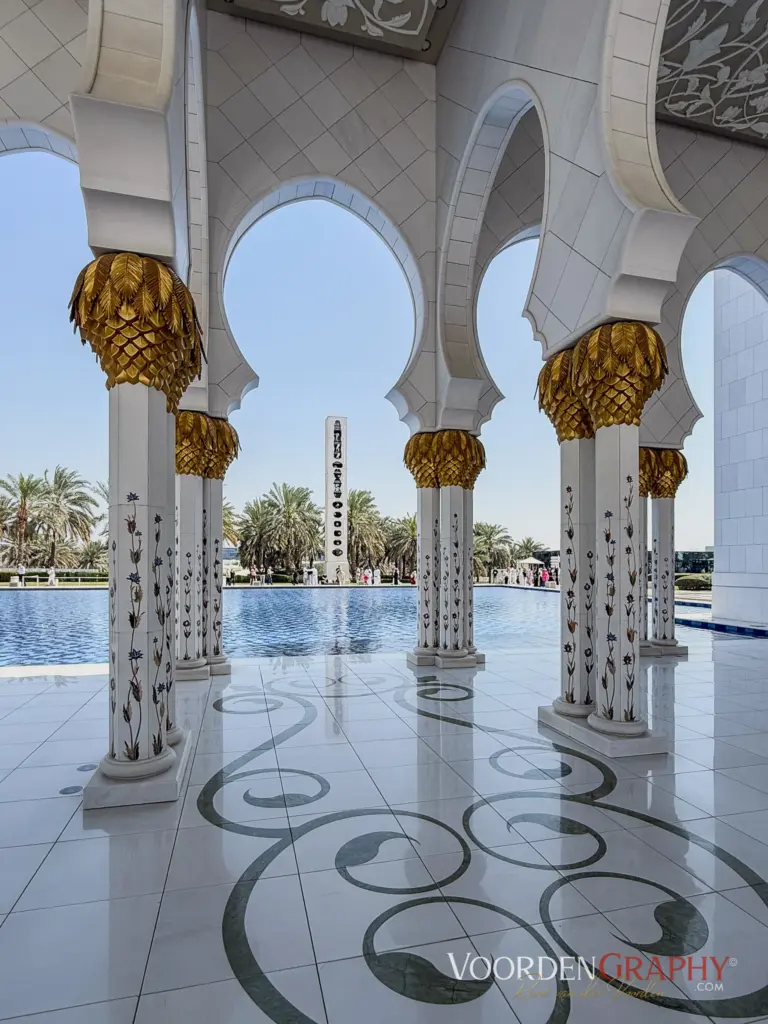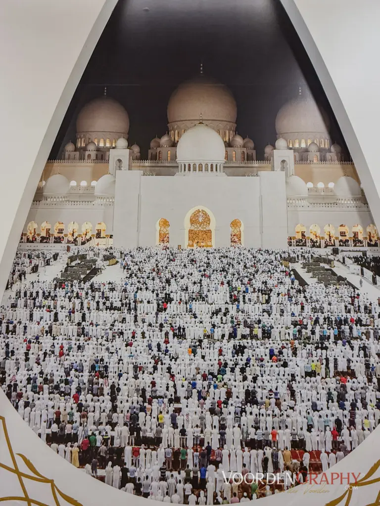 Ein weiteres Highlight folgt jedoch kurz darauf: Die beeindruckende Scheich-Zayid-Moschee auf 12 Hektar Gesamtareal. Das Hauptgebäude misst 224 × 174 Meter, ingesamt Platz für 40.000 Gläubige, vier 107 Meter hohe Minarette und eine 75 Meter hohe Hauptkuppel. 15 Marmorsorten aus u. a. Italien, Griechenland, Indien, China, Blattgold, ein 35 Tonnen schwerer handgeknüpfter Teppich aus dem Iran an dem über 1000 WeberInnen beteiligt waren, sowie riesige Kronleuchter, hergestellt in Deutschland, mit Swarovski-Kristallen – einer davon misst 10 Meter im Durchmesser und 15 Meter in der Höhe. Die Architektur vereint maurische, mamlukische, osmanische und fatimidische Elemente – also eine Art „Best of“ islamischer Baukunst. Prunk in Perfektion.